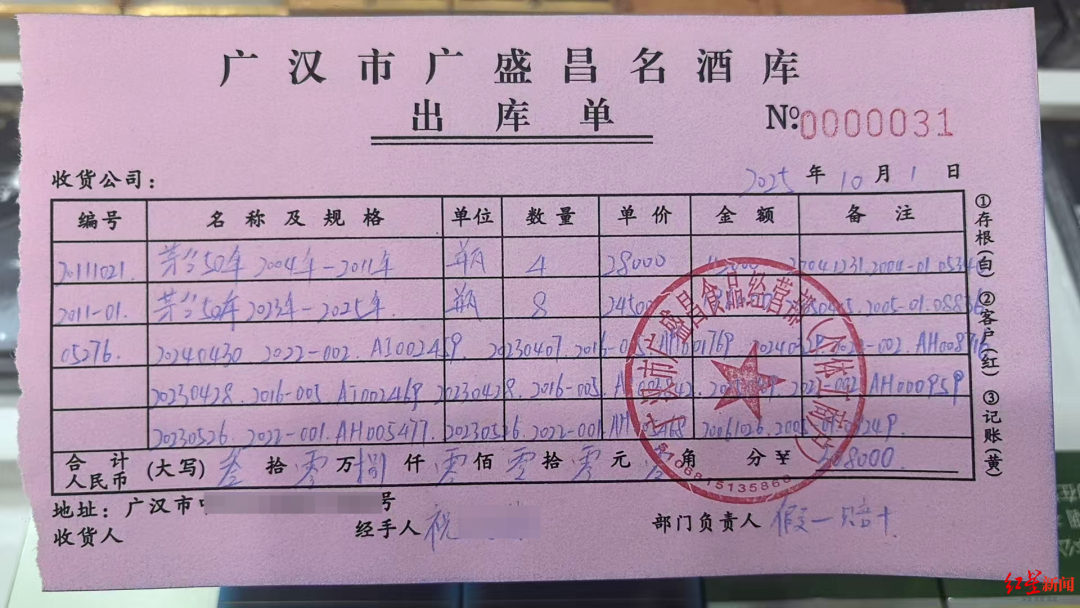 魏先生向红星新闻提供的出库单记录了这批茅台酒的构成:其中4瓶为2004年-2011年批次的茅台50年,单价高达28000元;另外8瓶为2023年-2025年批次的茅台50年,单价为24500元。整批酒水总价30.8万元。