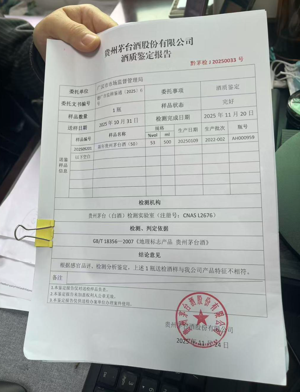2025年10月31日,经广汉市市场监管局委托,1瓶瓶号为AH000959的陈年贵州茅台酒(50年)被正式送往贵州茅台酒股份有限公司自身的检测实验室进行权威鉴定。